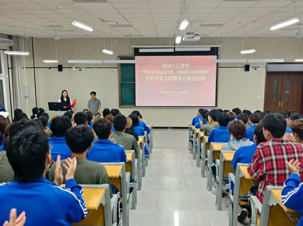 为隆重纪念中国人民抗日战争暨世界反法西斯战争胜利80周年,深入贯彻落实爱国主义教育要求,9月17日晚,由山东胜利职业学院马克思主义学院联合东营市社会科学界联合会共同主办的“黄河口大讲堂”社科普及志愿服务宣讲活动在山东胜利职业学院举行。