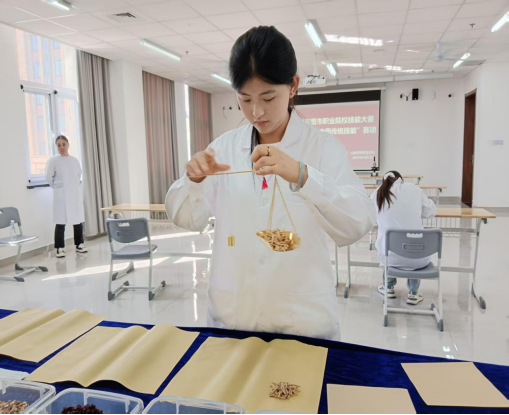 为确保赛事专业性与权威性,本次大赛严格参照《中国药典》2020 年版标准及国家相关职业规范设置竞赛内容,重点打造中药鉴定、中药调剂两大核心模块,融合理论考核与实操比拼,总分以百分制精准评定。其中,中药鉴定模块占比 60% ,对选手技能提出高要求:需在20 分钟内完成20味中药材及饮片的性状识别、10味药材的真伪鉴别,还需完成3种中药粉末的显微制片、特征绘制与精准鉴定,全方位考察选手对药材特性的掌握程度;中药调剂模块占比40% ,选手需从13 味饮片中精准筛选并调配 10 味×3 付处方,既要保证剂量精准无误,又要严格遵循操作规范,兼顾效率与质量,充分贴合岗位实际操作场景。