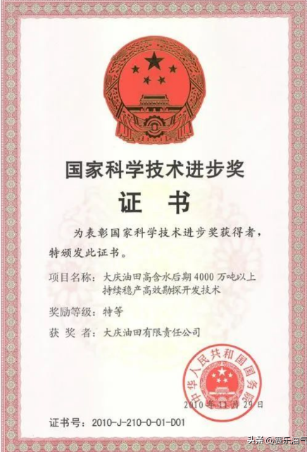 大庆油田高含水后期4000万吨以上持续稳产高效勘探开发技术项目获2010年度国家科技进步奖特等奖。该项目针对大庆油田高含水后期面临的油气资源接替不足、产量递减大、储采严重失衡、地面系统投资和能耗剧增等问题,自主研发了多层非均质大型砂岩油田高含水后期精细到0.2米单砂层级剩余油多维定量表征技术,创新形成了以完善单砂体注采关系为核心的精细高效挖潜技术系列,有效控制了水驱产量递减,累计多产油2681万吨。首次建立了聚合物弹性驱油理论,自主创新了采出液低温集输、加密井简省集油等工艺技术和设备,形成了新一代降本增效地面工程技术体系。