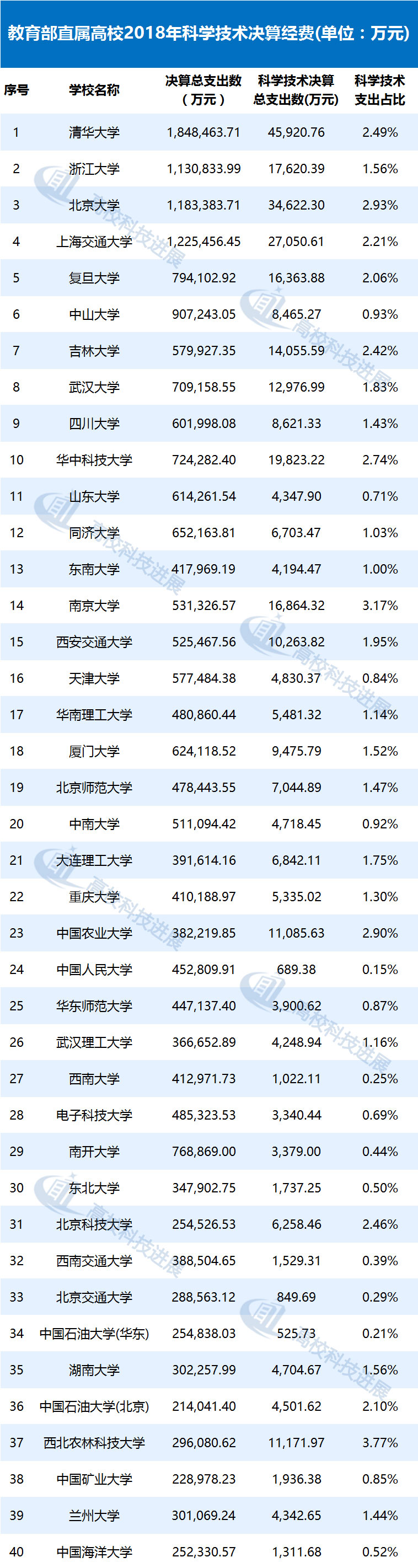 以下是教育部直属高校2018年科学技术决算支出数据(其中陕西师范大学相关网页无法打开,未能找到数据;华北电力大学数据为北京校部和保定校区的总和):