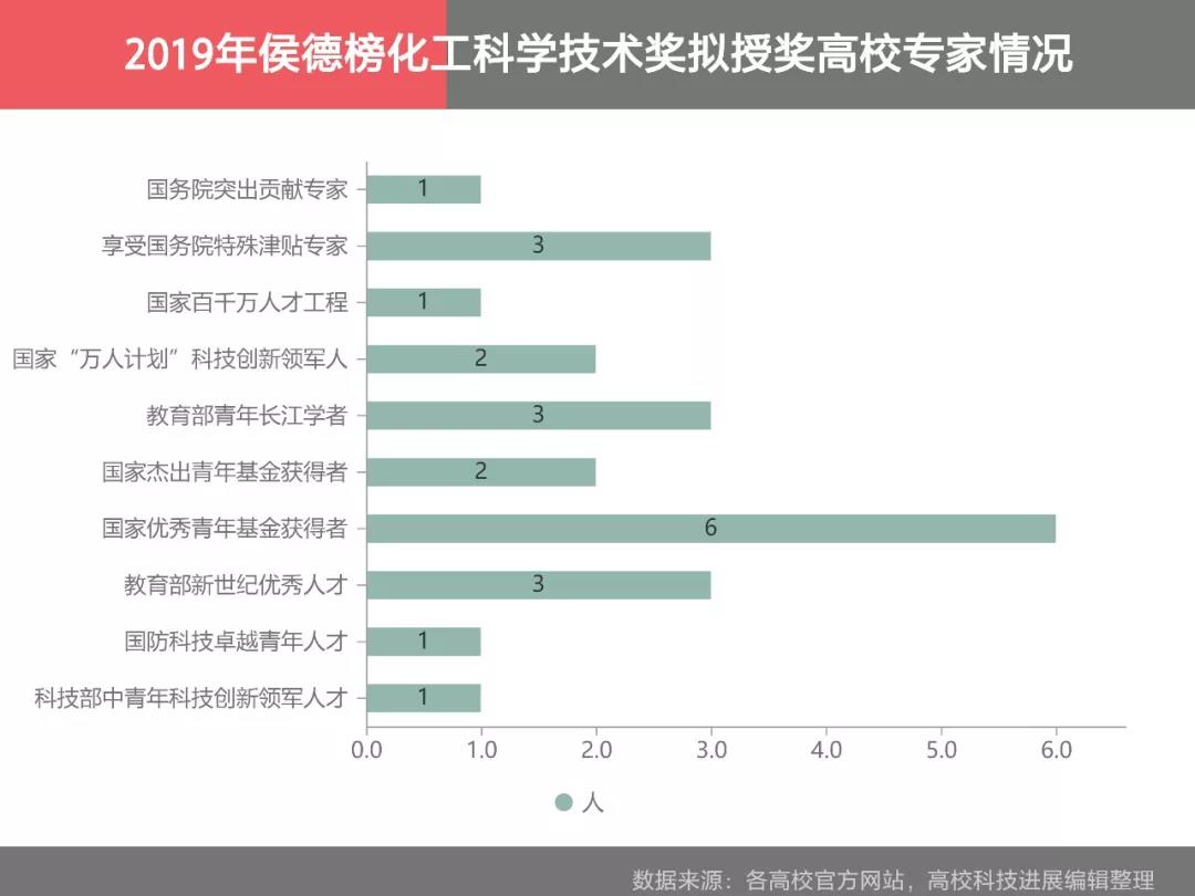 据不完全统计,在2019年侯德榜化工科学技术奖拟授奖的高校专家中,有国务院突出贡献专家1人,享受国务院特殊津贴专家3人,国家百千万人才工程1人,国家“万人计划”科技创新领军人才2人,教育部青年长江学者3人,国家杰出青年基金获得者2人,国家优秀青年基金获得者6人,教育部新世纪优秀人才3人,国防科技卓越青年人才1人,科技部中青年科技创新领军人才1人。