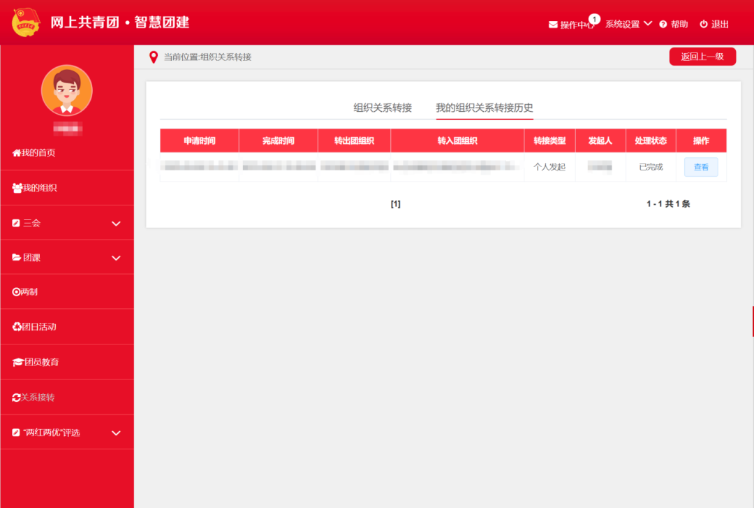 (六)转接进度查看:转接的进度可以在我的团组织关系转接历史中进行查看。