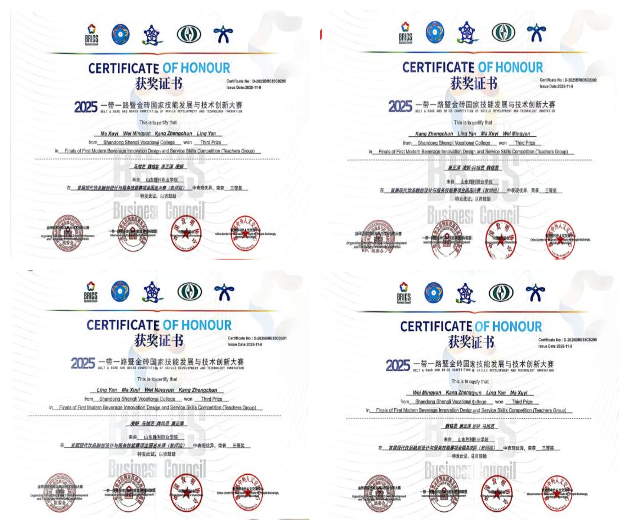 11月8日,山东胜利职业学院酒店管理学院教师团队在“首届现代饮品融创设计与服务技能赛项”中表现优异,荣获团队三等奖。该赛事作为金砖国家技能发展与技术创新大赛的重要组成部分,旨在推动“一带一路”背景下的国际服务合作与人才培养。