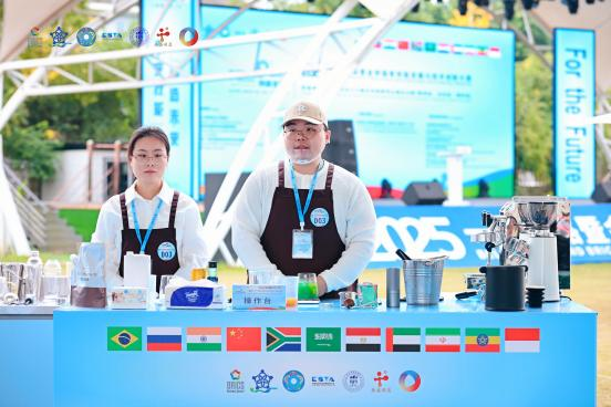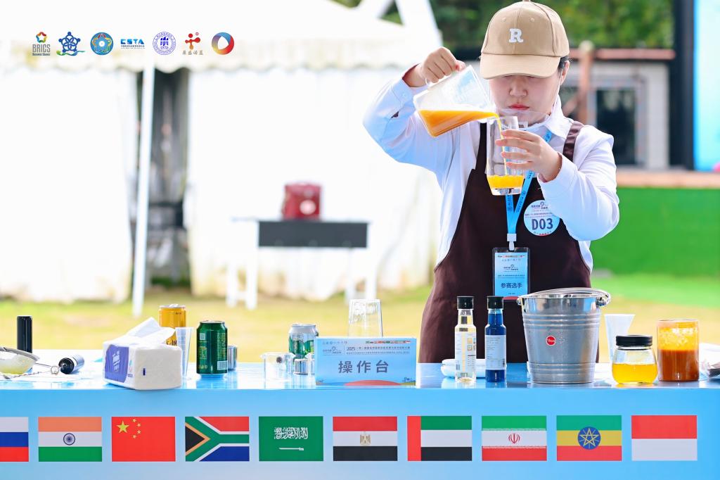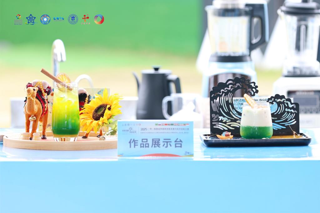 由康正淳、魏铭芸、凌妍、马旭艺四位教师组成的团队,以“金砖国家合作”与“丝路文化”为设计主线,深度融合东营市本土特色,创作出两款富有文化内涵的饮品。其中,“金砖之汇”融合巴西咖啡等金砖国家风味,并融入黄河“黄蓝交汇”自然景观与“河口剪纸”非遗元素;“丝路花雨”则以莱阳梨汁与黄栀子水为基础,搭配接骨木花糖浆与蓝柑苏打水,象征丝路文明的交融与繁荣。比赛中,团队运用双语阐述设计理念,展现出优秀的跨文化服务能力。