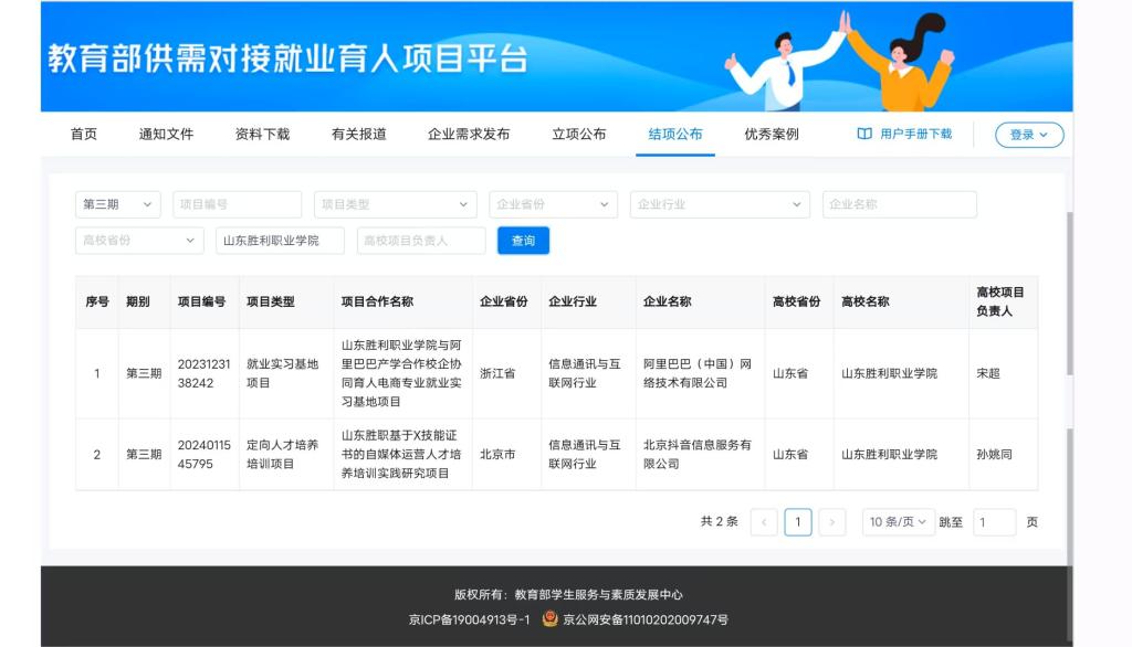 好消息!近期,教育部供需对接就业育人项目于官网公布第三期项目的结项名单,我校两个重点项目通过了教育部部级审核,并顺利结项!