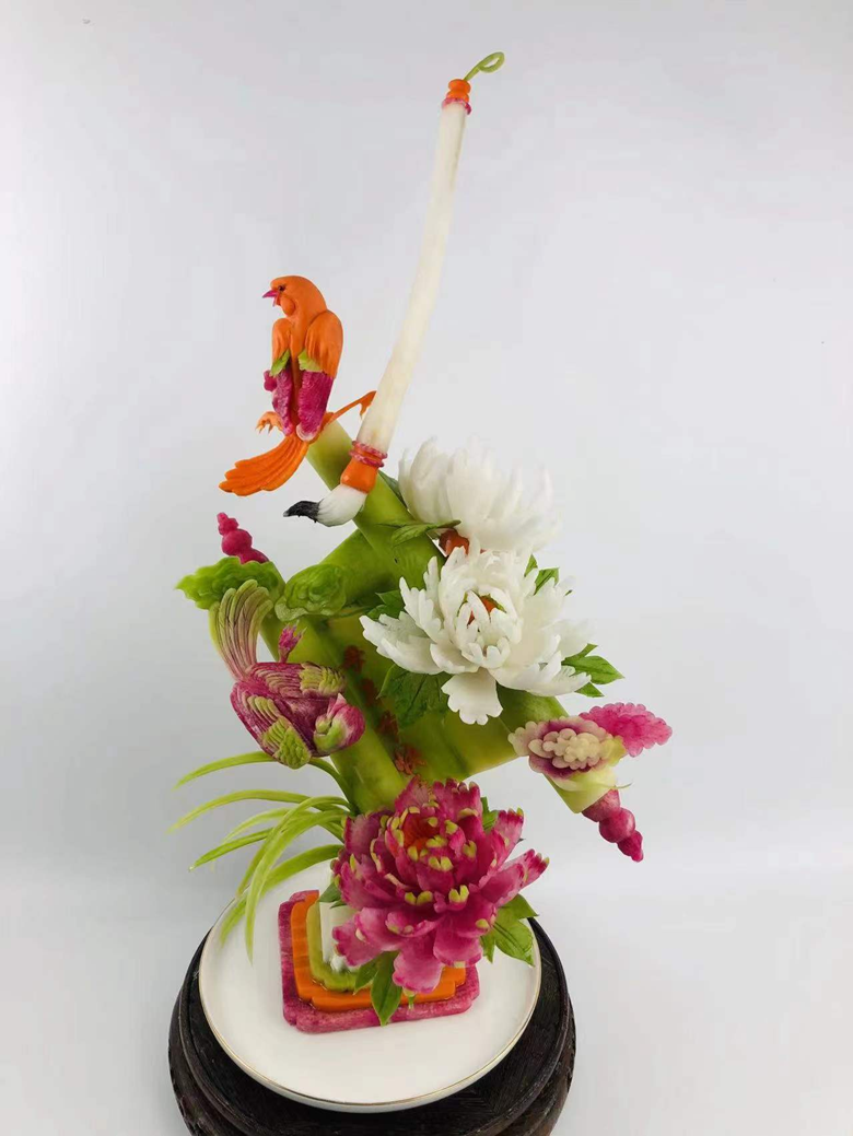 有的同学雕刻康乃馨,表达自己的感激之情;有的同学雕刻月季花,表达了自己浓浓的爱意;有的同学雕刻荷花,祝母亲好运连连;还有的同学做冷拼苹果,希望母亲能平平安安......雕刻比赛结束后,同学们把自己的雕刻作品拍照,发给自己的母亲,并送上祝福,虽是寥寥几句,但都真情流露。食品雕刻与冷拼专业课教师康恩建老师,雕刻了一款表达母爱的果蔬雕刻《无私的爱》。毛笔和书卷代表了父母对孩子的期望,栩栩如生的牡丹代表着对美好生活的向往,祝全天下的母亲节日快乐。