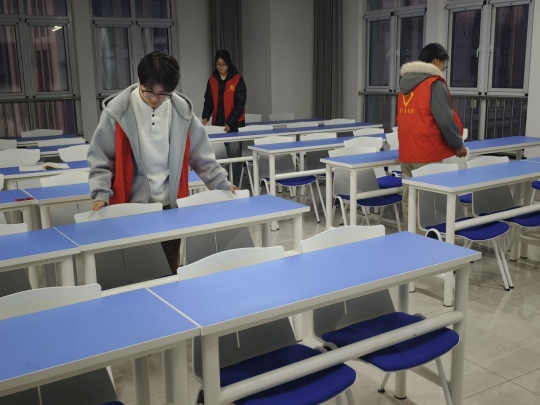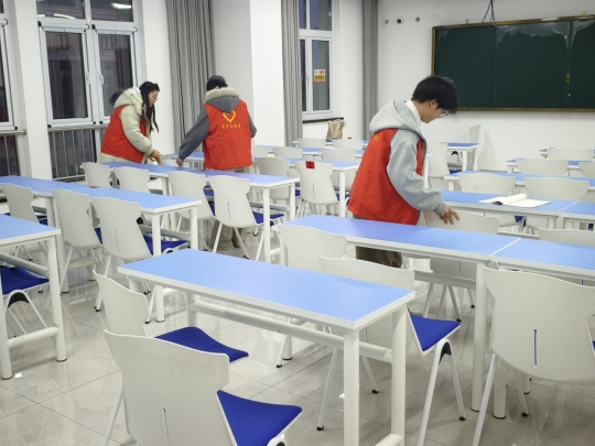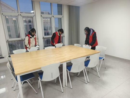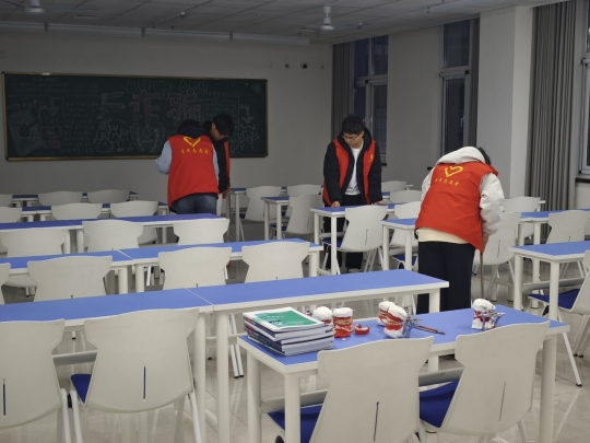 桌椅归位组的工作则考验着志愿者们的耐心与严谨。由于日常教学使用,部分课桌椅出现了歪斜、错位的情况。志愿者们两人一组,一人扶稳桌椅,一人调整位置,按照“横平竖直、间距均匀”的标准,将每一间教室的课桌椅重新排列。从第一排到最后一排,从左侧过道到右侧窗边,大家反复比对、精细调整,确保每一张课桌、每一把椅子都整齐划一,为师生打造出规整有序的课堂布局。