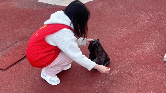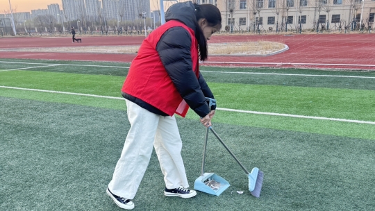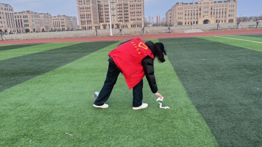 活动现场,志愿者们身着红色志愿马甲,迅速投入到清扫工作中。大家分工明确、协作有序,手持扫帚、垃圾袋等工具,对操场跑道、看台角落、绿化带等区域进行全面清理。有的志愿者俯身徒手仔细捡拾跑道缝隙中的纸屑,有的弯腰清理看台台阶下的杂物,有的专注清扫草坪周边的垃圾,不放过任何一处卫生死角。忙碌的身影穿梭在操场各处,红色马甲成为校园里最亮眼的风景,充分展现了爱尔创口腔学院学子不怕脏、不怕累的优良作风。