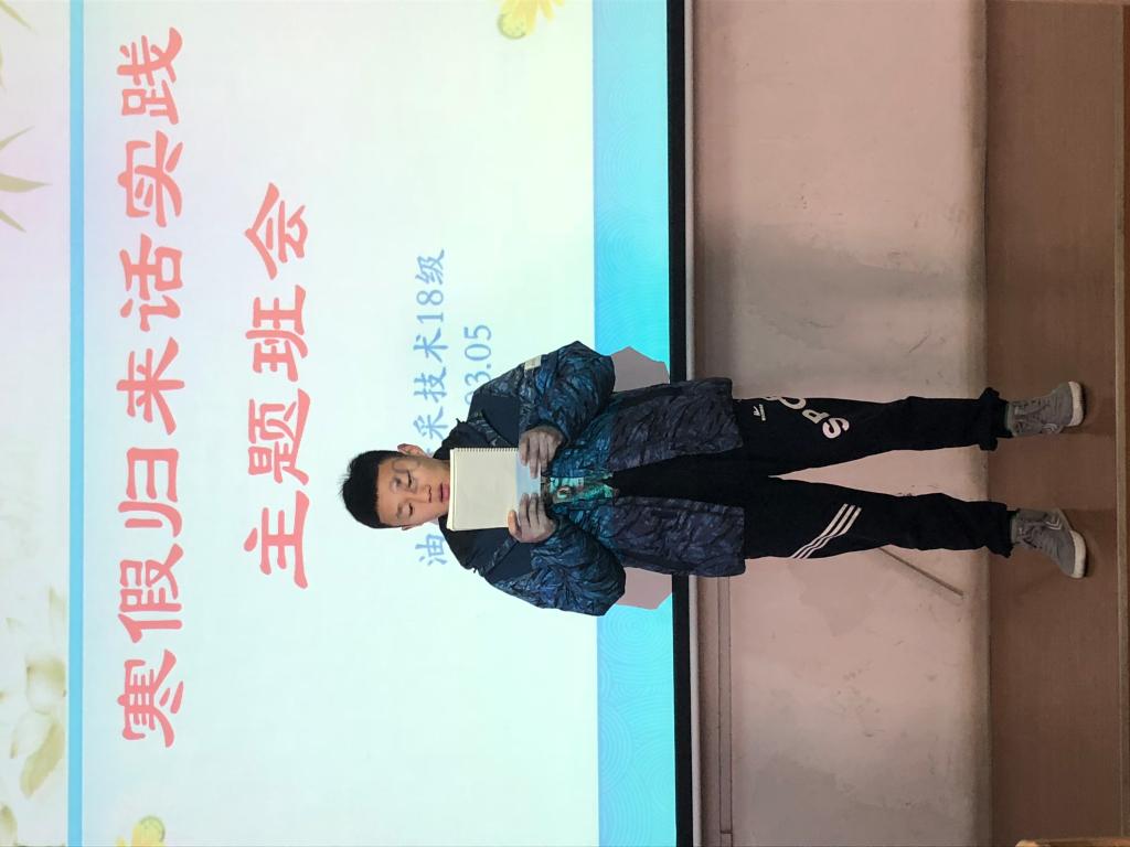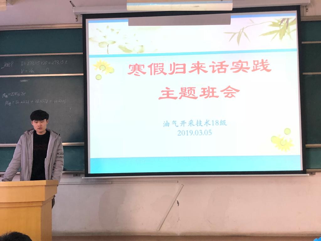 3月5日上午,石油工程学院在教学楼409教室举办了“寒假归来话实践”主题班会活动。首先由辅导员崔明磊老师介绍了班会的意义和流程,随后由团支书刘汉清同学主持班会。同学们积极上台各自分享自己在寒假实践中的所闻及所得,积极分享自己的实践经历,取得了非常好的效果。同学们在这次社会实践活动中有许多收获与感受,体会到了父母的艰辛,体会到了家的温暖,激励自己更好的学习,体会到了在工作时的辛苦和劳累,感受到了家乡的巨大的变化与发展,同时也感受到了自己一人在社会实践时的困难与挑战。