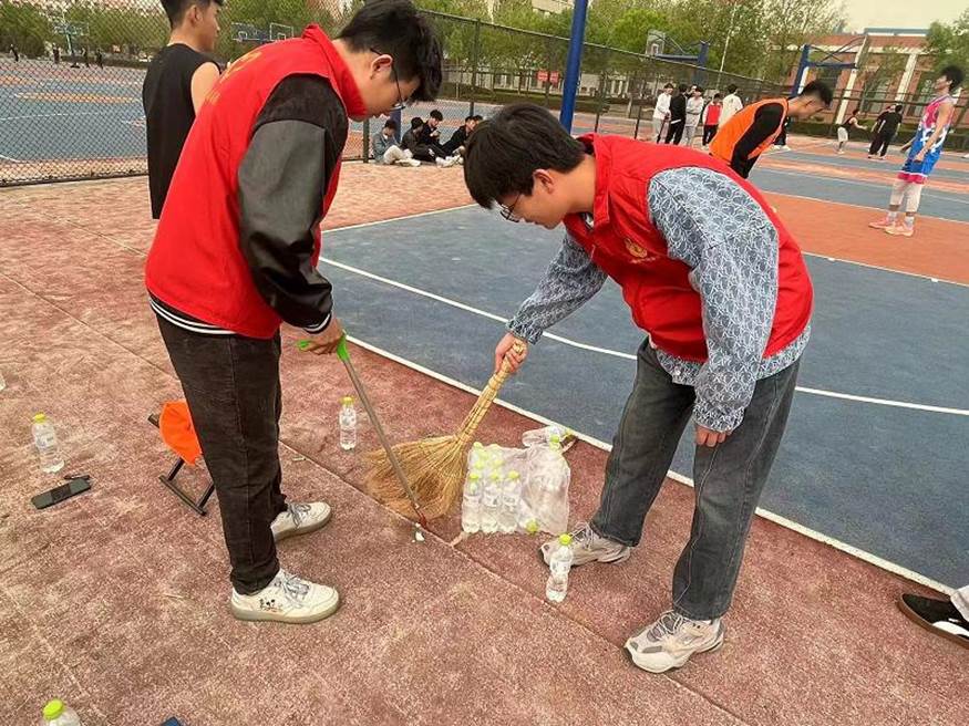 在这绿意盎然的操场上,点点“志愿红”格外耀眼。经过一番忙碌,遗落在角落的垃圾不复存在,篮球场、绿茵场、围栏等一尘不染。