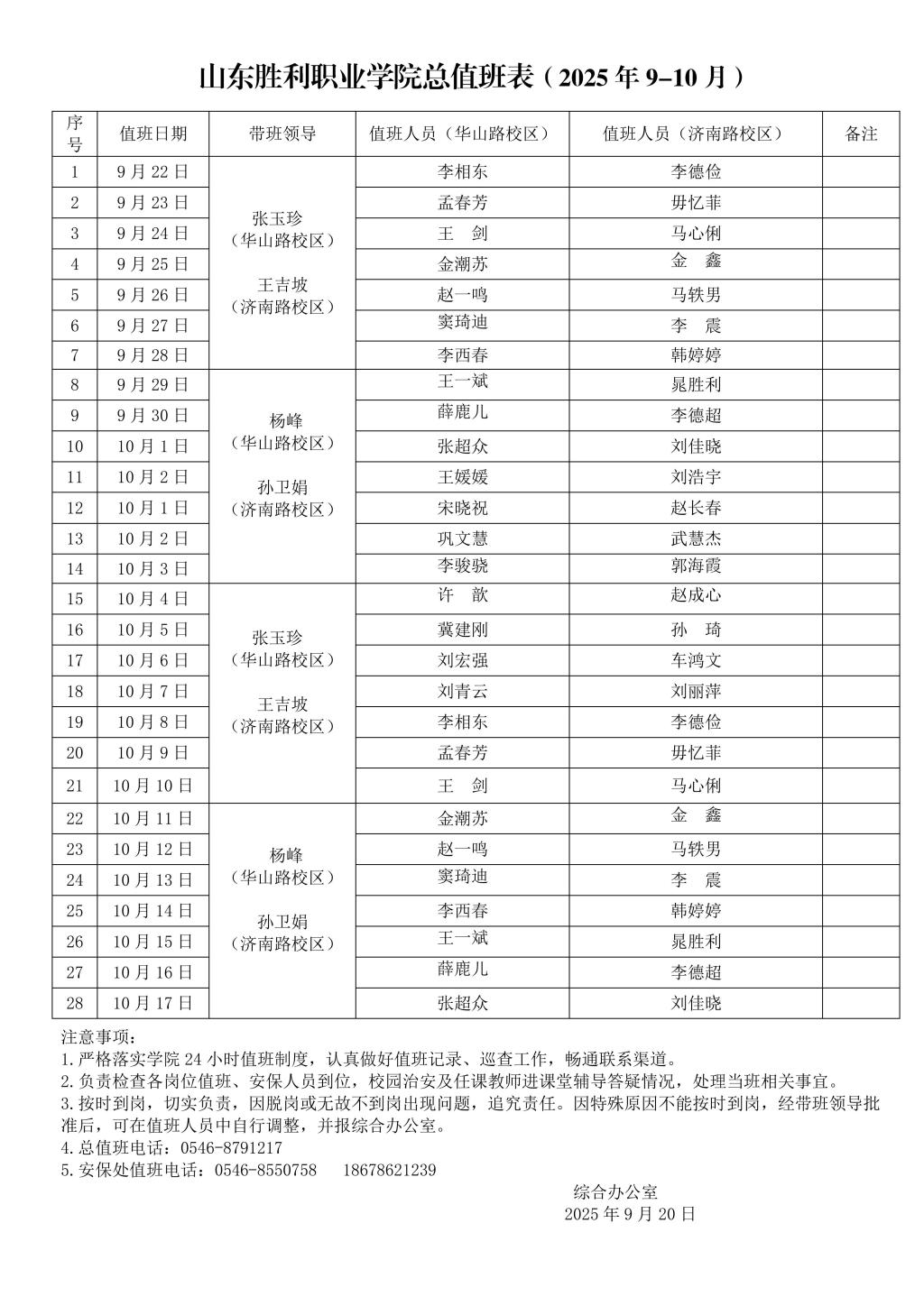 山东胜利职业学院10月份值班表