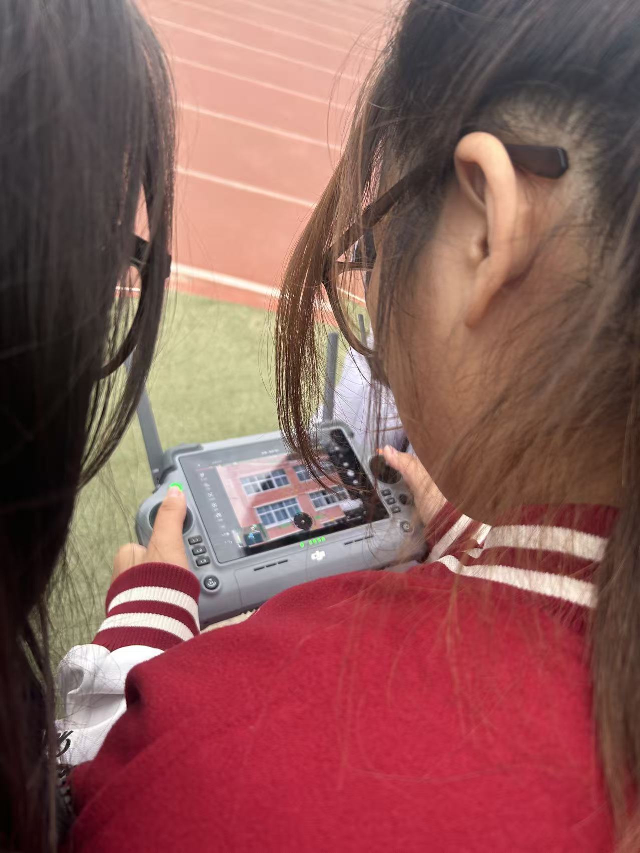 讲座结束后,实践体验环节在校园操场拉开帷幕。在技术人员的指导下进行模拟飞行训练。“左手摇杆控制高度与方向,右手摇杆控制前后左右位移,一定要注意杆量的轻重。”技术人员在旁耐心指导,纠正同学们的操作姿势。同学们满怀热情地参与到无人机实操中有的同学专注操控无人机遥控器,在专业人员指导下练习无人机的起飞、悬停、转向等基础动作;有的同学通过带屏遥控器实时查看无人机航拍画面,学习航拍构图与视角控制技巧。从教室的知识汲取到户外的实操尝试,同学们在“学”与“做”的结合中,切实感受到无人机技术的魅力,对专业技能提升和职业发展方向有了更直观的思考。