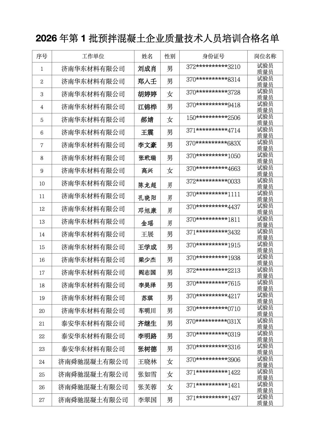 2026年第1批预拌混凝土企业质量技术人员培训合格名单