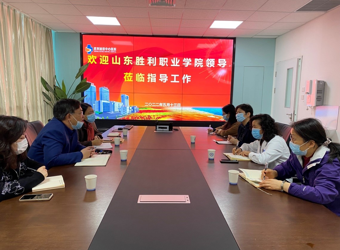 2022年5月13日,为全面落实国家教育部、山东省对高职院校人才培养工作的重要指示精神,和《山东胜利职业学院职业教育活动周实施方案》,护理学院党支部书记、院长索良,教学副院长刘素群以及张红霞、靳依鸣老师到胜利油田中心医院开展调研交流工作,并与胜利油田中心医院院长助理鲁梅芳,科教科主任张慕华、康复医院院长刘迎春以及护理部副主任孙爱辉等相关科室负责人进行座谈交流。