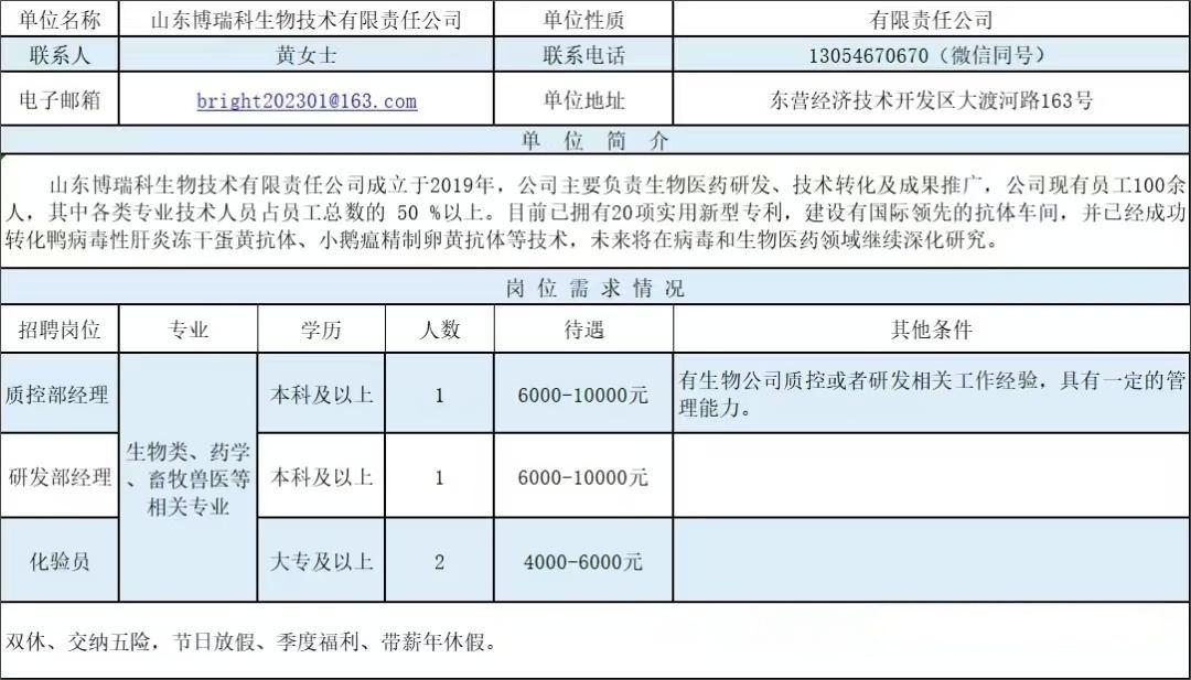 招聘信息——山东博瑞科生物技术有限责任公司